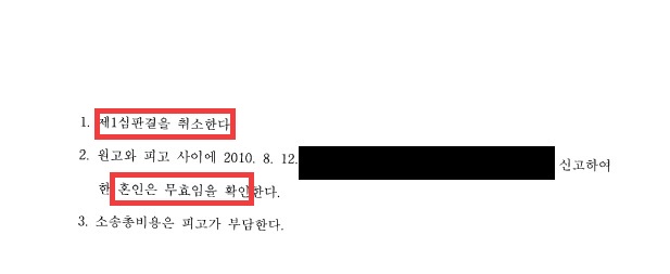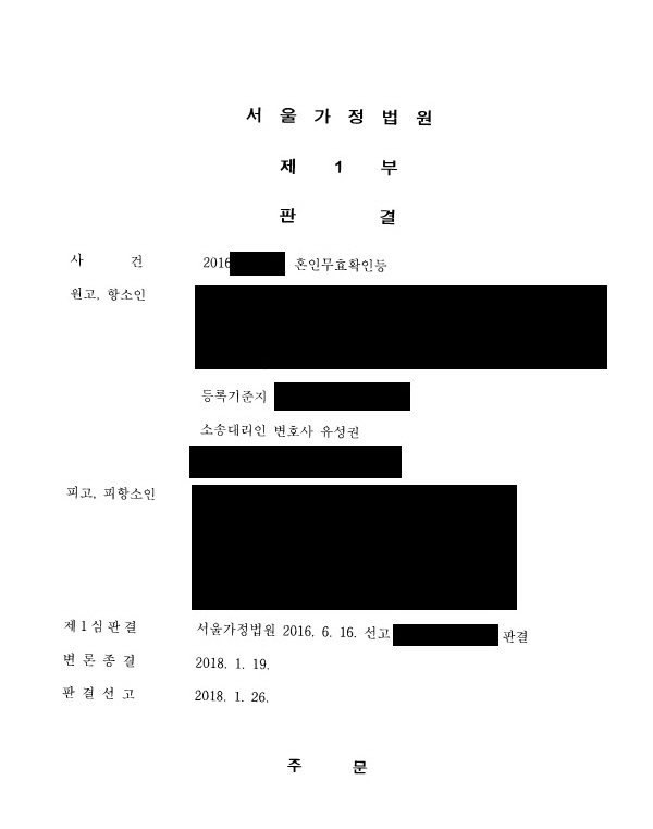 1½É¿¡¼ ¿ø°í´Â Çǰí¿Í È¥ÀÎÀÇ ÀÇ»çÇÕÄ¡ ¾øÀÌ ÀÌ·ç¾îÁø È¥ÀÎ½Å°í°¡ ¹«È¿¶ó´Â ÃëÁö·Î ¼Ò Á¦±âÇÏ¿´À¸³ª È¥ÀÎÀÇ»ç ÇÕÄ¡°¡ ¾ø¾ú´Ù°í ´ÜÁ¤Çϱ⿡´Â ºÎÁ·ÇÏ´ÙÇÏ¿© û±¸±â°¢ ÆÇ°áÀ» ¹Þ°Ô µÇ¾ú½À´Ï´Ù. 2½É¿¡¼ À¯¼º±Ç º¯È£»ç´Â ´Ù¸¥ ¸ñÀûÀ» À§ÇØ È¥ÀÎ ½Å°í¸¦ ¸¶Ä£ Á¡, È¥Àΰü°èÀÓ¿¡µµ ¿øÇǰíÀÇ ±³·ù°¡ ¾ø´Â Á¡ Áï È¥ÀÎÀÇ ½Çü°¡ ¾ø´Ù´Â Á¡µîÀ» ÁÖÀåÇÑ °á°ú, ¹ý¿øÀ¸·ÎºÎÅÍ 1½É ÆÇ°á Ãë¼Ò, È¥ÀÎ ¹«È¿ È®ÀÎ ÆÇ°áÀ» ¹Þ°Ô µÇ¾ú½À´Ï´Ù.