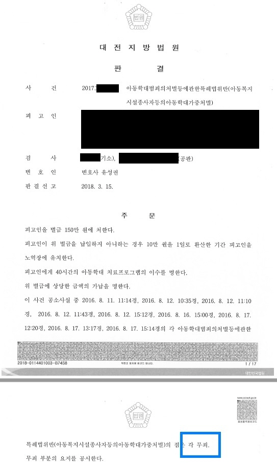 ÇǰíÀÎÀº ¾î¸°ÀÌÁý º¸À°±³»ç·Î ´ã´ç ¹ÝÀÇ ¾î¸°ÀÌ(ÇÇÇØÀÚ)¿¡°Ô Á¤¼Àû ¾Æµ¿Çд븦 ÇÏ¿´´Ù´Â ÇøÀÇ·Î ±â¼Ò°¡ µÇ¾ú½À´Ï´Ù. ÀÌÈÄ À¯¼º±Ç º¯È£ÀÎÀº ÇǰíÀÎÀÇ ¾Æµ¿Çдë ÀÇ»ç¿Í »ç½ÇÀÌ ¾ø¾ú´Ù´Â ÁÖÀåÀ» ÇÏ¿´°í ¹ý¿øÀ¸·ÎºÎÅÍ 10°³ÀÇ °ø¼Ò»ç½ÇÁß 9°³´Â ¹«ÁË, 1°³´Â ¹ú±Ý 150¸¸¿ø¿¡ óÇÑ´Ù´Â ÆÇ°áÀ» ¹Þ°Ô µÇ¾ú½À´Ï´Ù.