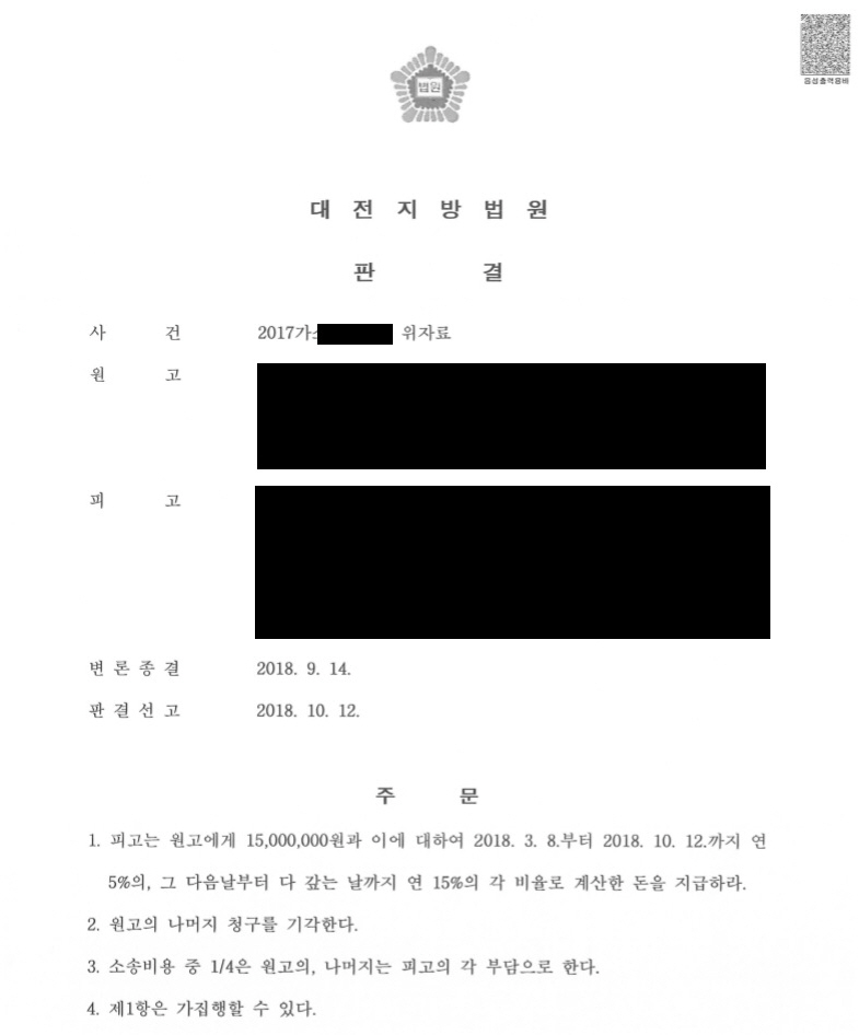 ¿ø°í´Â ¹è¿ìÀÚ¿Í ÇǰíÀÇ ºÎÁ¤ÇàÀ§·Î ÀÎÇÏ¿© È¥Àΰü°è°¡ ÆÄź¿¡ À̸£·¶´Ù°í ÆÇ´ÜµÇ¾î ¼Ò¸¦ Á¦±â ÇÏ¿´½À´Ï´Ù. ÀÌÈÄ ºÎÁ¤ÇàÀ§¿Í È¥Àΰü°è ÆÄź»çÀÌÀÇ Àΰú°ü°è¸¦ ÀÔÁõÇÏ¿© ¹Î»ç»ó ¼ÕÇØ¹è»óû±¸¸¦ ÇÑ °á°ú, ¹ý¿øÀ¸·ÎºÎÅÍ Çǰí´Â ¿ø°í¿¡°Ô 1,500¸¸¿øÀ» Áö±ÞÇ϶ó´Â ÆÇ°áÀ» ¹Þ°Ô µÇ¾ú½À´Ï´Ù.