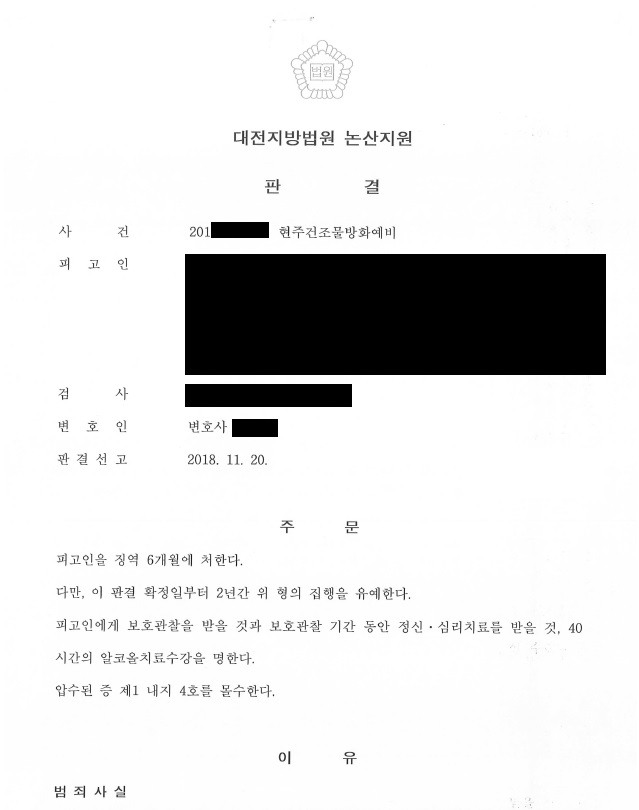 ÇǰíÀÎÀº ¹è¿ìÀÚÀÇ ¿Üµµ¸¦ ÀǽÉÇÏ´ø Áß ÀÌÈ¥¼·ù¸¦ ÁغñÇ϶ó´Â ¸»¿¡ Ȱ¡³ª ¼ú¿¡ ÃëÇÑ »óÅ·ΠÁýÀ» ã¾Æ°¡ ÈÖ¹ßÀ¯ 3ÅëÀ» ¹Ù´Ú µî¿¡ »Ñ¸° ÈÄ ºÒÀ» ºÙ¿© ºÐ½ÅÀÚ»ìÀ» ÇÏ·Á°í ÇÏ¿´À¸³ª °æÂûÀÌ Ã⵿ÇÏ´Â ¹Ù¶÷¿¡ Áö¸£Áö ¸øÇÏ¿´½À´Ï´Ù. ÇöÁÖ°ÇÁ¶¹°¹æÈ¿¹ºñÀÇ °æ¿ì¿¡µµ ÁßÇÑ »ç°Ç¿¡ ÇØ´çµÇ¾î ½ÇÇüÀÌ ³ª¿Ã ¼öµµ ÀÖ´Â »ç¾ÈÀÔ´Ï´Ù. À¯¼º±Ç º¯È£ÀÎÀº ÃʹüÀÎÁ¡, Àç¹ü °¡´É¼ºÀÌ ¾ø´Â Á¡ µîÀ» ÁÖÀåÇÏ¿©, ¹ý¿øÀ¸·ÎºÎÅÍ Â¡¿ª 6°³¿ù ÁýÇàÀ¯¿¹ 2³â, º¸¾ÈóºÐÀ» ¹Þ°Ô µÇ¾ú½À´Ï´Ù.