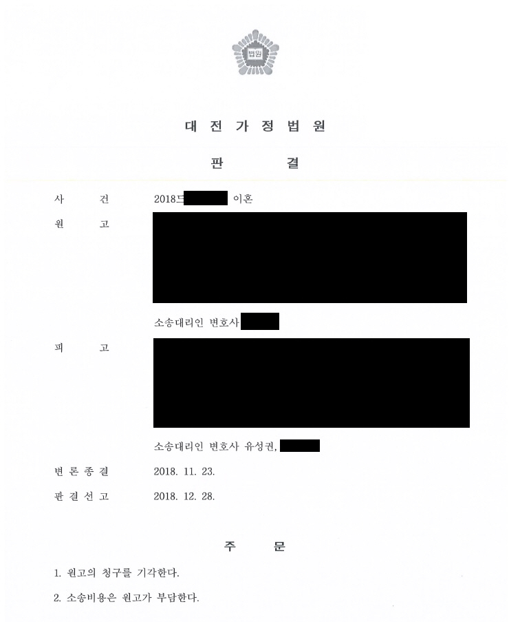 ¿ø°í´Â ¸î ³â Àü »ó°£ÀÚ¿Í ºÎÁ¤ÇàÀ§¸¦ ÇÑ ÈÄ ÇöÀç±îÁö Çǰí¿Í º°°Å»óÅ¿¡ ÀÖ´Ù°¡ ÀÌÈ¥À» û±¸ÇÑ »ç¾ÈÀÔ´Ï´Ù. À¯Ã¥¹è¿ìÀÚÀÇ °æ¿ì ¿øÄ¢ÀûÀ¸·Î ÀÌȥû±¸°¡ ºÒ°¡ÇÏÁö¸¸ ¿¹¿ÜÀûÀ¸·Î »ó´ë¹æÀÌ È¥ÀÎ Áö¼Ó Àǻ簡 ¾øÀ½¿¡µµ º¸º¹Àû °¨Á¤À¸·Î ÀÌÈ¥À» ÇÏÁö ¾Ê´Â µîÀÇ °æ¿ì¿¡´Â ÀÌȥû±¸°¡ °¡´ÉÇÕ´Ï´Ù. À̹ø »ç¾ÈÀÇ °æ¿ì ÇÇ°í¿¡°Ô ÀÌÈ¥»çÀ¯°¡ Á¸ÀçÇÏÁö ¾Ê°í, Çǰí´Â ÀÌÈ¥Àǻ簡 ¾øÀ¸¸ç ¿ø°íÀÇ ºÎÁ¤ÇàÀ§¸¦ ¿ë¼ÇÏ´Â µîÀÇ È¥Àΰü°è¸¦ Áö¼ÓÇÏ°í ½Í¾îÇÑ´Ù´Â °ÍÀ» ÁÖÀåÇÑ °á°ú, ¹ý¿øÀ¸·ÎºÎÅÍ ¿ø°í û±¸ ±â°¢ ÆÇ°áÀ» ¹Þ°Ô µÇ¾ú½À´Ï´Ù.