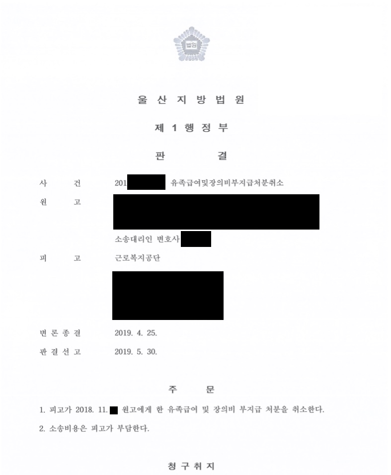 ¿ø°í´Â Áö³ 11¿ù ±Ù·Îº¹Áö°ø´ÜÀ¸·ÎºÎÅÍ À¯Á·±Þ¿© ¹× ÀåÀǺñ ºÎÁö±Þ óºÐ¿¡ ´ëÇÑ Ãë¼Ò¸¦ Çϱâ À§ÇØ ¼Ò¸¦ Á¦±âÇÑ »ç¾ÈÀÔ´Ï´Ù. ¿ø°íÀÇ »ç½ÇÈ¥ ¹è¿ìÀÚ´Â °ú°Å ±Ù¹« Áß »ç°í·Î ÀÎÇÏ¿© »êÀç 󸮰¡ µÇ¾î »ç¸ÁÇϱâ Àü ±îÁö ÀåÇØ¿¬±ÝÀ» ¼ö·ÉÇϰí ÀÖ¾ú½À´Ï´Ù. ±×·¯´Ù ¿ø°íÀÇ »ç½ÇÈ¥ ¹è¿ìÀÚ°¡ »ç¸ÁÀ» ÇÏ¸é¼ »ê¾÷ÀçÇØº¸»óº¸Çè¹ý »ó ¼ö±ÞÀÚÀÎ ¿ø°í´Â À¯Á·±Þ¿© ¹× ÀåÀǺñ¸¦ û±¸ÇÏ¿´À¸³ª ±Ù·Îº¹Áö°ø´ÜÀº ¸ÁÀÎÀÇ »ç¸ÁÀÌ ¾÷¹«»ó ÀçÇØ¿¡ ÇØ´çÇÏÁö ¾Ê´Â´Ù°í º¸¾Æ ºÎÁö±Þ óºÐÀ» ÇÏ¿´½À´Ï´Ù. ÀÌÈÄ À¯¼º±Ç º¯È£»ç´Â ¿ø°í¿Í »ç¾ÈÀ» °ËÅäÇÑ ÈÄ ¿ø°íÀÇ »ç½ÇÈ¥ ¹è¿ìÀÚ°¡ °ú°Å »ç°í·Î ÀÎÇÏ¿© ¿À·£ ±â°£µ¿¾È ±Ø½ÉÇÑ ÅëÁõÀ» È£¼ÒÇÏ¿´°í ÀÌ·Î ÀÎÇÏ¿© ¹®Á¦°¡ µÇ¾î »ç¸ÁÇÑ °ÍÀ̶ó´Â °ÍÀ» Àû±Ø ÁÖÀåÇÑ °á°ú, ¹ý¿øÀ¸·ÎºÎÅÍ À¯Á·±Þ¿© ¹× ÀåÀǺñ ºÎÁö±Þ óºÐÀ» Ãë¼ÒÇÑ´Ù´Â ÆÇ°áÀ» ¹Þ°Ô µÇ¾ú½À´Ï´Ù.