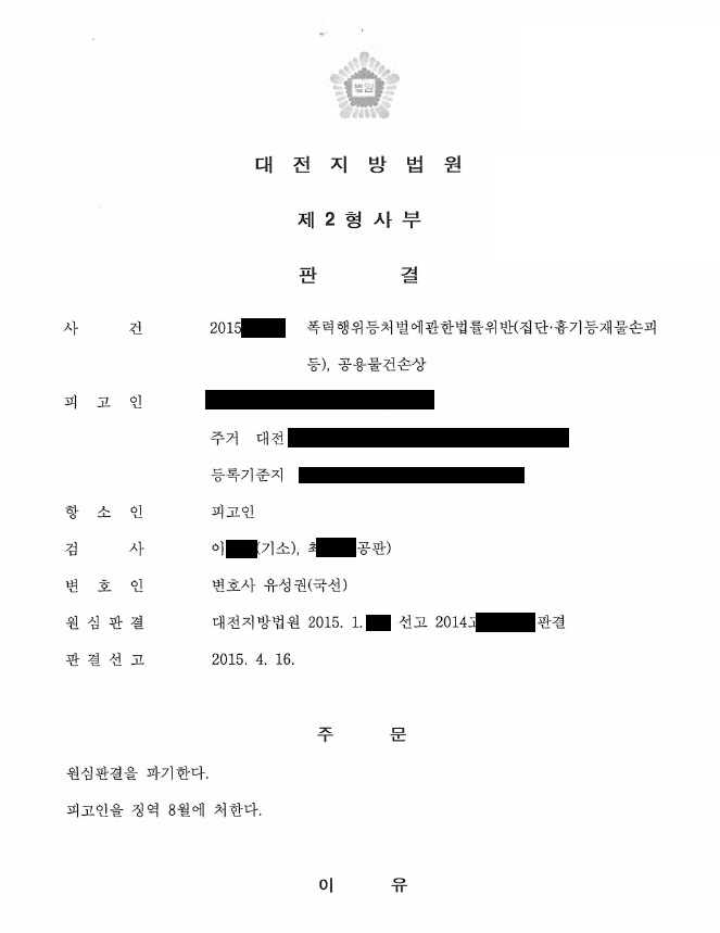 ÇǰíÀÎÀº Áö³ 2014³â 6¿ù°æ ´ëÀüÀÇ ¡Û¡ÛÆÄÃâ¼Ò¿¡¼ °ø¹«¼Ò¿¡¼ »ç¿ëÇÏ´Â ¹°°ÇÀ» ¼Õ»ó½ÃŰ°í °°Àº ³¯ ´Ù½Ã °ø¹«¼Ò¿¡¼ »ç¿ëÇÏ´Â ¹°°ÇÀ» ¼Õ»ó½ÃŲ »ç½Ç·Î ÀÎÇÏ¿© ÇöÇà¹üÀ¸·Î üÆ÷µÇ¾î ¡¿ª 1³âÀ» ¼±°í ¹Þ¾Ò½À´Ï´Ù. ÀÌÈÄ ¾çÇüºÎ´çÀ» ÀÌÀ¯·Î Ç×¼Ò¸¦ Á¦±âÇÏ¿´°í À¯¼º±Ç º¯È£ÀÎÀÌ ±¹¼±º¯È£ÀÎÀ¸·Î Âü¿©ÇÏ¿© ¹üÇà»ç½Ç ÀÚ¹é, ¹Ý¼º ¹× ½É½Å¹Ì¾àµîÀ» ÁÖÀåÇÏ¿© ¡¿ª 8¿ù ½Â¼ÒÆÇ°áÀ» ¹Þ°Ô µÇ¾ú½À´Ï´Ù.