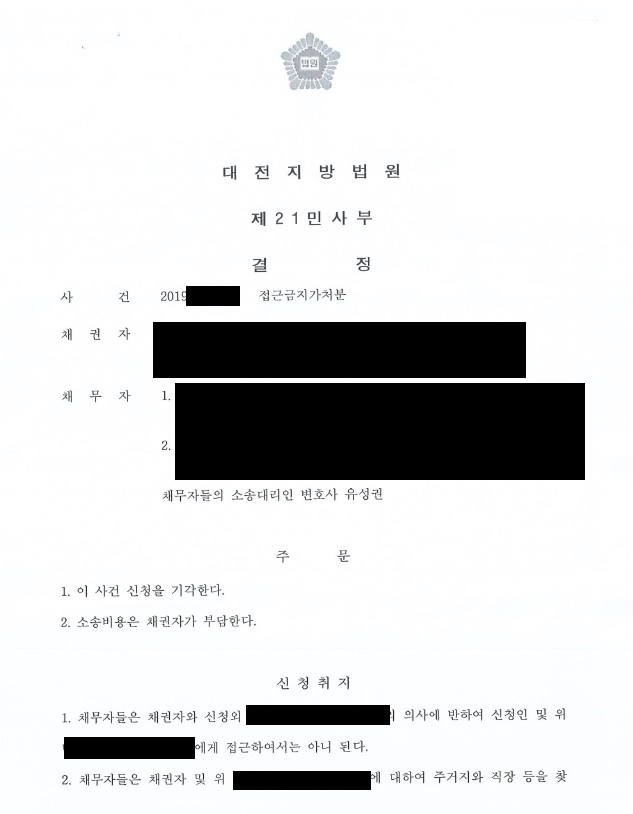 ä±ÇÀڴ ä¹«ÀÚµéÀÌ °ÅÁÖÁö¿Í Á÷Àå¿¡ ¼öÂ÷·Ê ã¾Æ¿Í¼ Æò¿ÂÇÑ »ýȰÀ» ÀúÇØÇÏ¿´À¸¹Ç·Î ÀÌ¿¡ ´ëÇØ Á¢±Ý±ÝÁö°¡Ã³ºÐ½ÅûÀ» ÇÏ¿´½À´Ï´Ù. Á¢±Ù±ÝÁö°¡Ã³ºÐ½ÅûÀÌ ÀοëµÇ±â À§Çؼ´Â °è¼ÓÇÏ´Â ±Ç¸®°ü°è¿¡ ³¢Ä¥ ÇöÀúÇÑ ¼ÕÇØ¸¦ ÇÇÇϰųª ±Þ¹ÚÇÑ À§ÇèÀ» ¸·±â À§ÇÏ¿© ¶Ç´Â ±× ¹ÛÀÇ Çʿ䰡 ÀÖÀ» °æ¿ì¿¡¸¸ °¡´ÉÇѵ¥ Çö »ç¾È¿¡¼´Â ±Þ¹ÚÇÑ À§ÇèÀÌ ÇöÁ¸ÇÏÁö ¾Ê°í ä±ÇÀÚ¿¡°Ô À§Çظ¦ °¡ÇÑÀûÀÌ ¾ø¾ú´Ù´Â °Í°ú ä±ÇÀÚ¸¦ ã¾Æ°£ µ¿±â´Â Àç»ê ºÐÀï°ú °ü·ÃµÈ ºÎ¼öÀû »ç¾ÈÀ» ÇØ°áÇϱâ À§ÇÑ °ÍÀ̾ú´Ù´Â °ÍÀ» Àû±Ø ÁÖÀåÇÑ °á°ú, ¹ý¿øÀ¸·ÎºÎÅÍ ¿ø°í û±¸ ±â°¢ ÆÇ°áÀ» ¹Þ°Ô µÇ¾ú½À´Ï´Ù.