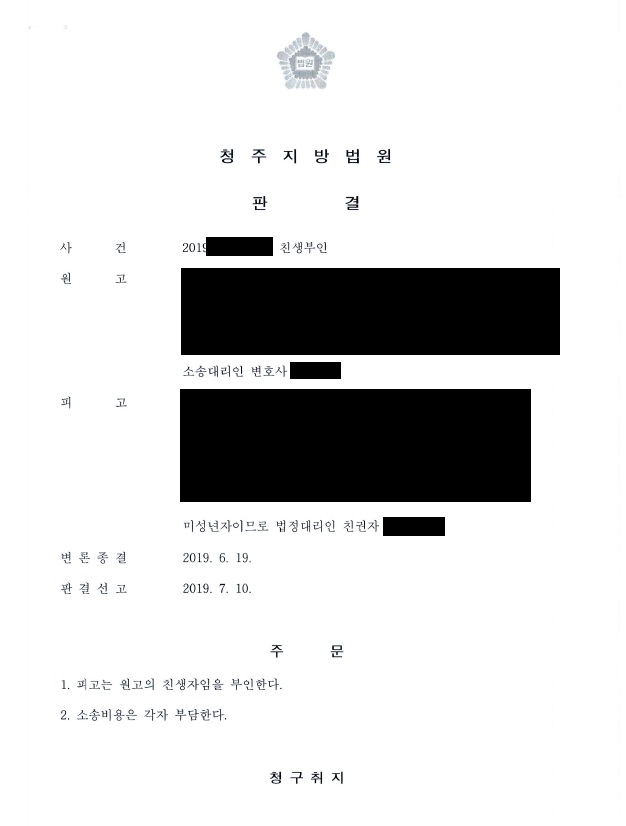 ¿ø°í´Â Áö³ 18³â 12¿ù ÃÊ¿¡ ÀçÆÇ»ó ÀÌÈ¥À» ÇÑ ÈÄ °¡Á·°ü°èÁõ¸í¼¸¦ È®ÀÎÇÏ¿´´Ù°¡ ÇÇ°í°¡ ÀÚ³à·Î µî·ÏµÇ¾î ÀÖ´Â °ÍÀ» È®ÀÎÇÏ¿´°í ÀÌÈÄ ÇǰíÀÇ »ý¸ð¿Í ¿¬¶ôÀ» ÇÏ¿© ¿ø°íÀÇ Àڳడ ¾Æ´Ï¶ó´Â °ÍÀ» ¾Ë°Ô µÇ¾î Ä£»ýºÎÀÎ ¼Ò¸¦ Á¦±âÇÑ »ç¾ÈÀÔ´Ï´Ù. Ãâ»ý½Ã±â»óÀ¸·Î´Â ¹Î¹ý¿¡ ÀÇÇØ ¿ø°íÀÇ Ä£»ýÀÚ·Î ÃßÁ¤ÀÌ µÇÁö¸¸ À¯ÀüÀÚ°Ë»ç°á°ú·Î Ä£ÀÚ°ü°è°¡ ¼º¸³ÇÏÁö ¾Ê´Â ´Ù´Â °ÍÀ» ÁÖÀåÇÏ¿© ¹ý¿øÀ¸·ÎºÎÅÍ, ¿ø°í û±¸ ÀÎ¿ë ÆÇ°áÀ» ¹Þ°Ô µÇ¾ú½À´Ï´Ù.
