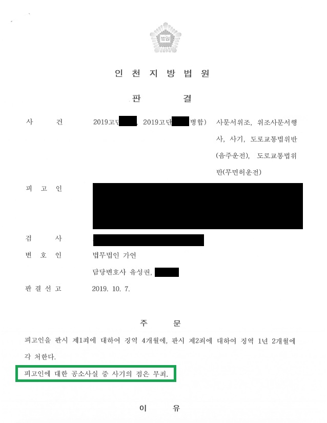 ÇǰíÀÎÀº »ç¹®¼À§Á¶, À§Á¶»ç¹®¼Çà»ç, µµ·Î±³Åë¹ýÀ§¹Ý(¹«¸éÇã, À½ÁÖ¿îÀü), »ç±â·Î ±â¼Ò°¡ µÇ¾ú½À´Ï´Ù. ¹üÇàÀº »ç±â¸¦ Á¦¿ÜÇÑ ³ª¸ÓÁö´Â ¸ðµÎ ´©¹ü±â°£ Áß¿¡ ¹ß»ýÇÏ¿© ÇǰíÀο¡°Ô ºÒ¸®ÇÏ¿´À¸³ª ¿©·¯ ¾çÇü »çÀ¯¸¦ ÁÖÀåÇÏ¿© °¢ ¡¿ª 4°³¿ù, ¡¿ª 1³â 2°³¿ù¿¡ óÇÑ´Ù´Â ÆÇ°áÀ» ¹Þ°Ô µÇ¾ú½À´Ï´Ù. »ç±âÁËÀÇ °æ¿ì ÇǰíÀÎÀº Çϵµ±Þ ¹ÞÀº »ç½ÇÀÌ ¾øÀ½¿¡µµ ÇÇÇØÀÚ¿¡°Ô Çϵµ±Þ ¹Þ¾Æ ÀϺΠ°ø»ç¸¦ ¸Ã±â°Ú´Ù°í ÇÏ¸é¼ °ø»ç ÁøÇà¿¡ ÇÊ¿äÇÑ µ·À» ºô·Á´Þ¶ó°í ÇÏ¿© ÆíÃëÇÏ¿´½À´Ï´Ù. ±×·¯³ª ÇǰíÀÎÀº ÇØ´ç »ç°Ç°ú °ü·ÃÇÏ¿© µ·À» Áö±Þ¹ÞÀº °ÍÀÌ ¾Æ´Ï¶ó ÇØ´ç »ç°Ç°ú °ü·Ã ¾ø´Â ´Ù¸¥ °ø»ç¿Í °ü·ÃÇÏ¿© ¹ÞÀº °ÍÀ̶ó°í ÁÖÀåÇÏ¿´°í ÇÇÇØÀÚÀÇ Áø¼ú ¶ÇÇÑ ½Åºù¼ºÀÌ ¾ø´Ù´Â µî ±â¸ÁÇÑ »ç½ÇÀÌ ¾øÀ½À» Àû±Ø ÁÖÀåÇÏ¿© »ç±âÁË¿¡ ´ëÇØ¼´Â ¹«ÁË ÆÇ°áÀ» ¹Þ°Ô µÇ¾ú½À´Ï´Ù.