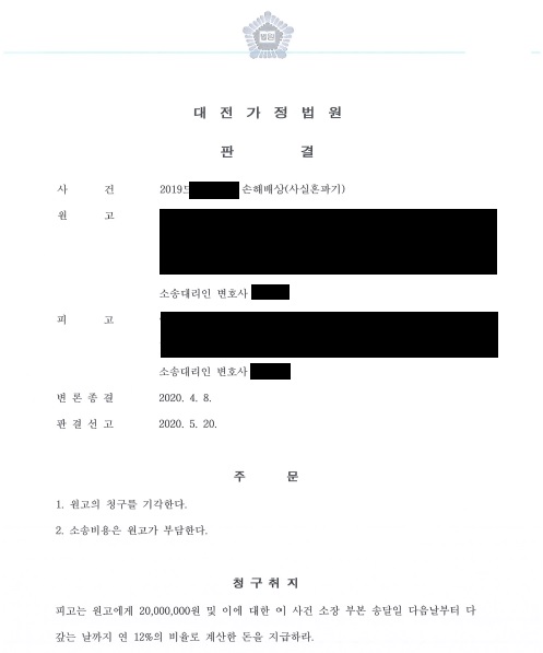 ¿ø°í´Â ÇÇ°í°¡ »ç½ÇÈ¥ °ü°è¿¡ ÀÖ´ø ¹è¿ìÀÚ¿Í ºÎÁ¤ÇàÀ§¸¦ ÇÏ¿© »ç½ÇÈ¥ °ü°è°¡ ÆÄźµÇ¾úÀ¸¹Ç·Î ¼ÕÇØ¹è»ó ÇÒ Ã¥ÀÓÀÌ ÀÖ´Ù°í ÇÏ¿´À¸³ª, À¯¼º±Ç º¯È£»ç´Â ¿ø°í ´ç»çÀÚµéÀÇ °ü°è°¡ »ç½ÇÈ¥À¸·Î º¸±â ¾î·Á¿ì¹Ç·Î ¼ÕÇØ¹è»ó Ã¥ÀÓÀÌ ¾ø´Ù°í ¹Ý¹ÚÇÑ °á°ú, ¹ý¿øÀ¸·ÎºÎÅÍ ¿ø°í û±¸ ±â°¢ ÆÇ°áÀ» ¹Þ°Ô µÇ¾ú½À´Ï´Ù.