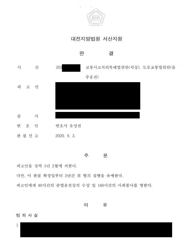 ÇǰíÀÎÀº °ú°Å À½ÁÖ¿îÀüÀ¸·Î ó¹ú¹ÞÀº Àü·ÂÀÌ ÀÖÀ½¿¡µµ ºÒ±¸ÇÏ°í ¶Ç´Ù½Ã À½ÁÖ¿îÀüÀ¸·Î ÇÇÇØÀÚÀÇ Â÷·®À» µéÀÌ ¹Þ¾Æ ÇÇÇØÀڵ鿡°Ô »óÇØ¸¦ ÀÔÇô ±³Åë»ç°í󏮯¯·Ê¹ýÀ§¹Ý(Ä¡»ó), µµ·Î±³Åë¹ýÀ§¹Ý(À½ÁÖ¿îÀü)À¸·Î ±â¼ÒµÈ »ç¾ÈÀÔ´Ï´Ù. ÀÌÈÄ À¯¼º±Ç º¯È£ÀÎÀº ¿©·¯ ¾çÇü»çÀ¯¸¦ Àû±Ø ÁÖÀåÇÑ °á°ú, ¹ý¿øÀ¸·ÎºÎÅÍ Â¡¿ª 1³â 2¿ù¿¡ ÁýÇàÀ¯¿¹ 2³âÀÇ ÆÇ°áÀ» ¹Þ°Ô µÇ¾ú½À´Ï´Ù.
