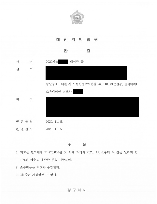 ¿ø°í´Â ÇÇ°í¿¡°Ô µ·À» ´ë¿©ÇÏ¿´À¸³ª Çǰí´Â ÀϺθ¸ º¯Á¦ÇÏ°í ³ª¸ÓÁö¿¡ ´ëÇØ¼´Â º¯Á¦ÇÏÁö ¾Ê¾Æ ¼Ò¸¦ Á¦±âÇÑ »ç¾ÈÀÔ´Ï´Ù. ÀÌÈÄ ¹ý¿øÀ¸·ÎºÎÅÍ, Çǰí´Â ¿ø°í¿¡°Ô 21,875,000¿øÀ» Áö±ÞÇ϶ó´Â ÆÇ°áÀ» ¹Þ°Ô µÇ¾ú½À´Ï´Ù.