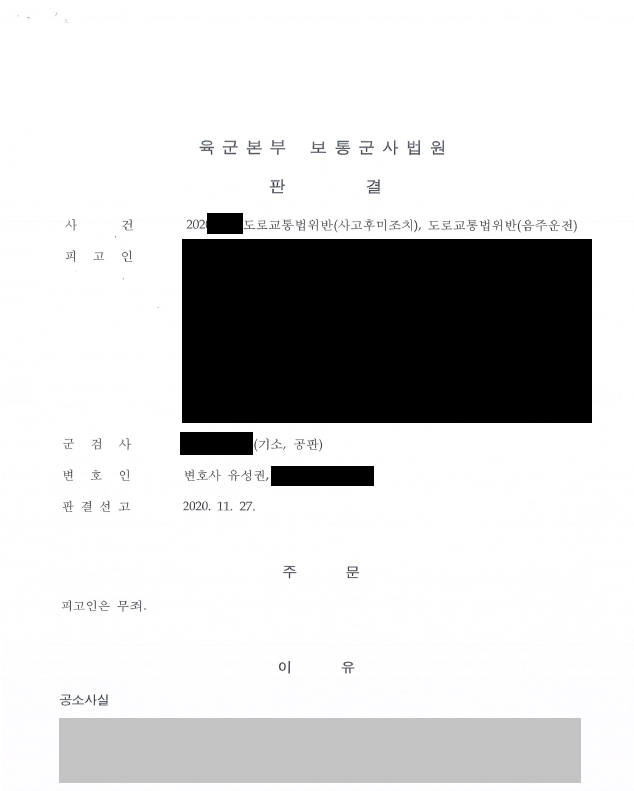 ÇǰíÀÎÀº ÁöÀεé°ú Àú³á ¸ðÀÓ ÈÄ ¿îÀüÀ» ÇÏ°í °¡´ø Áß ¾ÈÀüÇÏ°Ô ¿îÇàÇØ¾ß ÇÒ ¾÷¹«»ó ÁÖÀÇÀǹ«°¡ ÀÖÀ½¿¡µµ º¸ÇàÀÚ ½ÅÈ£±â¿Í Ãæµ¹ÇÏ¿© À̸¦ ÆÄ¼ÕÇÏ°íµµ ÇÊ¿äÇÑ Á¶Ä¡¸¦ ÇÏÁö ¾Ê¾Æ µµ·Î±³Åë¹ýÀ§¹Ý(»ç°íÈĹÌÁ¶Ä¡, À½ÁÖ¿îÀü)À¸·Î ±â¼ÒµÇ¾ú½À´Ï´Ù. ±×·¯³ª À¯¼º±Ç º¯È£ÀÎÀº ÇǰíÀÎÀÌ À½ÁÖ¿îÀüÇÑ »ç½ÇÀÌ ¾øÀ¸¸ç À̸¦ ÀÔÁõÇϱâ À§ÇØ Àú³á ¸ðÀÓ¿¡ Âü¿©ÇÑ »ç¶÷µéÀ» ÁõÀνŹ®ÇÏ¿´°í, ±³Åë»ç°í ÈÄ Á¤Â÷ÇÏ¿© ºñ»ê¹°À» Ä¡¿ì´Â µî ÇÊ¿äÇÑ Á¶Ä¡¸¦ ´ÙÇÏ¿´À¸¹Ç·Î °¢ ¹«Á˸¦ ÁÖÀåÇÏ¿´½À´Ï´Ù. ±× °á°ú, ¹ý¿øÀ¸·ÎºÎÅÍ ¹«ÁË ÆÇ°áÀ» ¹Þ°Ô µÇ¾ú½À´Ï´Ù.