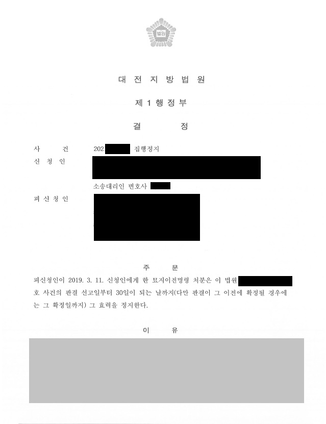 ÇǽÅûÀÎÀº ½ÅûÀο¡°Ô ¹¦ÁöÀÌÀü¸í·É óºÐÇÏ¿´À¸³ª ½ÅûÀÎÀº ¹¦ÁöÀÌÀü¸í·ÉÃë¼Ò »ç°ÇÀÌ È®Á¤µÉ¶§±îÁö ÁýÇàÀ» Á¤ÁöÇØ´Þ¶ó´Â ½ÅûÀ» ÇÑ °á°ú, ¹ý¿øÀ¸·ÎºÎÅÍ ÆÇ°á ¼±°íÀϺÎÅÍ 30ÀÏÀÌ µÇ´Â ³¯±îÁö ±× È¿·ÂÀ» Á¤ÁöÇÑ´Ù´Â °áÁ¤À» ¹Þ°Ô µÇ¾ú½À´Ï´Ù.