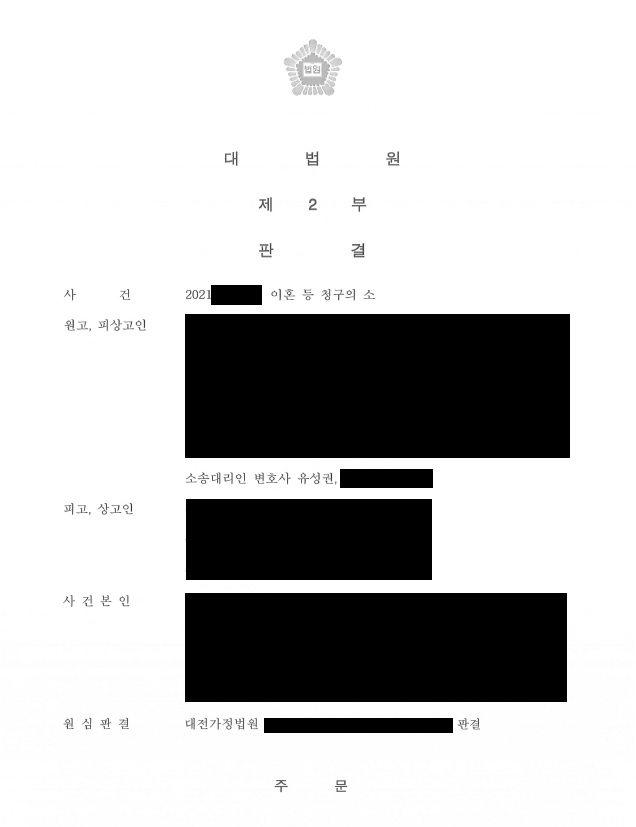 ¿ø°í´Â Àå±â°£ º°°Å·Î ÀÎÇÏ¿© È¥ÀÎ °ü°è°¡ ÆÄźµÇ¾î ÀÌÈ¥ û±¸ÇÑ »ç¾ÈÀÔ´Ï´Ù. Çǰí´Â ÀÌÈ¥ Àǻ簡 ¾ø¾úÀ¸³ª ¿ø°í´Â Àå±â°£ º°°Å µîÀ¸·Î ºÎºÎ°ü°è ȸº¹ÀÌ ¾î·Á¿ì¸ç Çǰí´Â °ü°è °³¼±¿¡ ³ë·ÂÀ» ÇÏÁö ¾Ê´Â´Ù´Â Á¡ µîÀ» ÁÖÀåÇÑ °á°ú, ¹ý¿øÀ¸·ÎºÎÅÍ ¿ø Çǰí ÀÌÈ¥°ú Ä£±ÇÀÚ ¹× ¾çÀ°ÀÚ·Î ¿ø°í¸¦ ÁöÁ¤ÇÑ´Ù´Â µîÀ» ¹Þ°Ô µÇ¾ú½À´Ï´Ù. ÀÌÈÄ Çǰí´Â ºÒº¹ÇÏ¿© »ó°íÇÏ¿´À¸³ª ´ë¹ý¿øÀ¸·ÎºÎÅÍ »ó°í ±â°¢ ÆÇ°áÀ» ¹Þ°Ô µÇ¾ú½À´Ï´Ù.