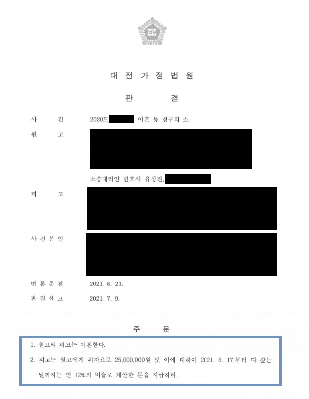 ¿ø°í´Â È¥ÀÎ ÈÄ ÇÇ°í°¡ ¾Æ¹«·± ÀÌÀ¯ ¾øÀÌ °¡ÃâÇÑ ÈÄ ºÎÁ¤ÇàÀ§ µîÀ» ÀúÁú·¯ Á¤»óÀûÀΠȥÀΰü°è¸¦ À¯ÁöÇϱⰡ ¾î·Æ´Ù°í ÆÇ´ÜµÇ¾î ÀÌÈ¥ û±¸ÇÑ »ç¾ÈÀÔ´Ï´Ù. Çǰí´Â È¥ÀÎ ±â°£ µ¿¾È ¾çÀ°ÇØ¾ß ÇÒ Àڳడ ÀÖÀ½¿¡µµ ºÒ±¸ÇÏ°í °æÁ¦Àû ´É·Â ºÎÁ·À¸·Î »ýȰºñ ¹× °æÁ¦ÀûÀÎ ¹®Á¦¸¦ ¿ø°í°¡ ºÎ´ãÇÑ Á¡, È¥Àΰü°è ÆÄźÀÇ ¿øÀÎÀÌ ÇÇ°í¿¡°Ô ÀÖ´Â Á¡ µîÀ» ÂüÀÛÇÏ¿© À§ÀÚ·á ÀÌõ¿À¹é¸¸ ¿øÀ» û±¸ÇÏ¿´½À´Ï´Ù. ¶ÇÇÑ »ç°Ç º»Àο¡ ´ëÇÑ ¾çÀ°±Ç°ú ¾çÀ°ºñ¸¦ û±¸ÇÑ °á°ú, ¹ý¿øÀ¸·ÎºÎÅÍ ¿ø Çǰí ÀÌÈ¥, Çǰí´Â ¿ø°í¿¡°Ô À§ÀÚ·á ÀÌõ¿À¹é¸¸ ¿ø Áö±Þ, ¾çÀ°±ÇÀÚ´Â ¿ø°í·Î ÇÑ´Ù´Â ÆÇ°áÀ» ¹Þ°Ô µÇ¾ú½À´Ï´Ù.