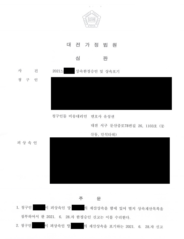 û±¸ÀÎÀº ÇÇ»ó¼ÓÀÎÀÇ »ç¸Á ÈÄ Àç»êÀ» Á¤¸®Çϱâ À§ÇØ ÇÑÁ¤½ÂÀÎ ¹× »ó¼ÓÆ÷±â¸¦ û±¸ÇÑ »ç¾ÈÀÔ´Ï´Ù. ÀÌÈÄ Àû±ØÀç»ê°ú ¼Ò±ØÀç»êÀ» Á¤¸®ÇÏ¿© û±¸ÇÑ °á°ú, ¹ý¿øÀ¸·ÎºÎÅÍ ÇÑÁ¤½ÂÀÎ ¹× »ó¼ÓÆ÷±â¸¦ ¼ö¸®ÇÑ´Ù´Â ½ÉÆÇÀ» ¹Þ°Ô µÇ¾ú½À´Ï´Ù.