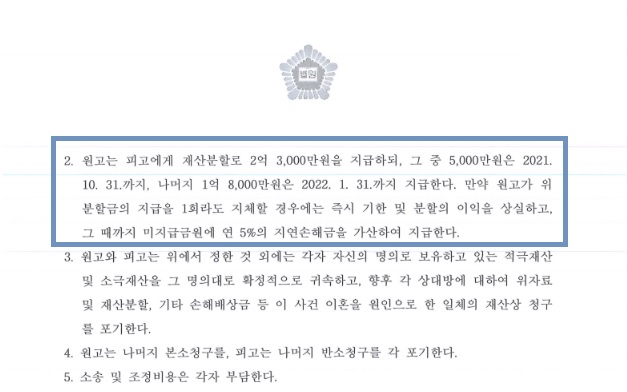 ¿ø°í´Â ÇǰíÀÇ À¯Ã¥»çÀ¯·Î ÀÎÇÏ¿© È¥Àΰü°è°¡ ÆÄźÀÌ µÇ¾ú´Ù¸ç ÀÌÈ¥À» û±¸ÇÑ »ç¾ÈÀÔ´Ï´Ù. ¿ø°í´Â ÇÇ°í¿¡°Ô Àç»êºÐÇÒ·Î 1¾ï ¿øÀ» Áö±ÞÇÏ°í ³ª¸ÓÁö û±¸¸¦ Æ÷±âÇ϶ó°í ÇÏ¿´À¸³ª Çǰí´Â ÀÌ¿¡ ¹Ý¼Ò¸¦ ÇÏ¿´°í ÀÌÈÄ Á¶Á¤À» ÇÑ °á°ú, ¿ø Çǰí ÀÌÈ¥, ¿ø°í´Â ÇÇ°í¿¡°Ô Àç»êºÐÇÒ·Î 2¾ï 3,000¸¸¿øÀ» Áö±ÞÇÏ´Â °ÍÀ¸·Î Á¶Á¤ÀÌ µÇ¾ú½À´Ï´Ù.