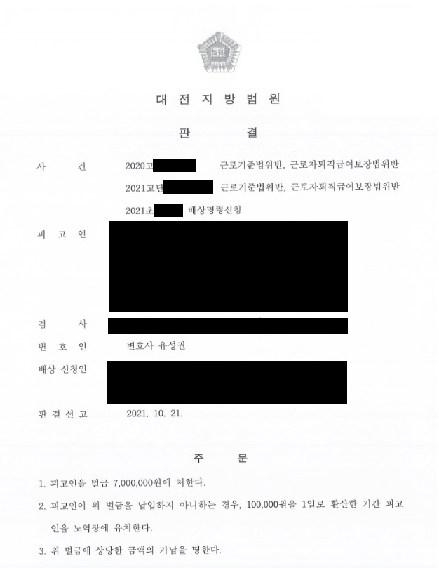 ÇǰíÀÎÀº ȸ»ç¸¦ ¿î¿µÇÏ´Â »ç¿ëÀÚ·Î ±Ù·ÎÀÚ°¡ ÅðÁ÷ÇÑ °æ¿ì ±× Áö±Þ»çÀ¯°¡ ¹ß»ýÇÑ ¶§ºÎÅÍ 14ÀÏ À̳»¿¡ ÀÓ±Ý µîÀ» Áö±ÞÇÏ¿©¾ß ÇÔ¿¡µµ ºÒ±¸ÇÏ°í ±Ù·ÎÀÚÀÇ ÀÓ±ÝÀ» üºÒÇÏ¿© ±Ù·Î±âÁعýÀ§¹Ý, ±Ù·ÎÀÚÅðÁ÷±Þ¿©º¸Àå¹ýÀ§¹ÝÀ¸·Î ±â¼Ò°¡ µÇ¾ú½À´Ï´Ù. ÀÌÈÄ ÇǰíÀÎÀº ÇÇÇØÀÚµéÀÇ ÇÇÇØ¸¦ ±ÝÀüÀûÀ¸·Î º¸»óÇϱâ À§ÇÑ ³ë·ÂÀ» ÇÏ¿´°í ±× °á°ú, ÀϺΠÇÇÇØÀÚµéÀÌ ÇǰíÀο¡ ´ëÇÑ Ã³¹úºÒ¿ø Àǻ縦 Ç¥½ÃÇÏ¿´½À´Ï´Ù. ÀÌÈÄ ¹ý¿øÀ¸·ÎºÎÅÍ Ã³¹úºÒ¿ø ÀÇ»çÇ¥½Ã¸¦ ÇÑ ÇÇÇØÀڵ鿡 ´ëÇØ¼´Â °ø¼Ò±â°¢À» ¹Þ°í ³ª¸ÓÁö¿¡ ´ëÇØ¼´Â ¹ú±Ý 7,000,000¿ø¿¡ óÇÑ´Ù´Â ÆÇ°áÀ» ¹Þ°Ô µÇ¾ú½À´Ï´Ù.
