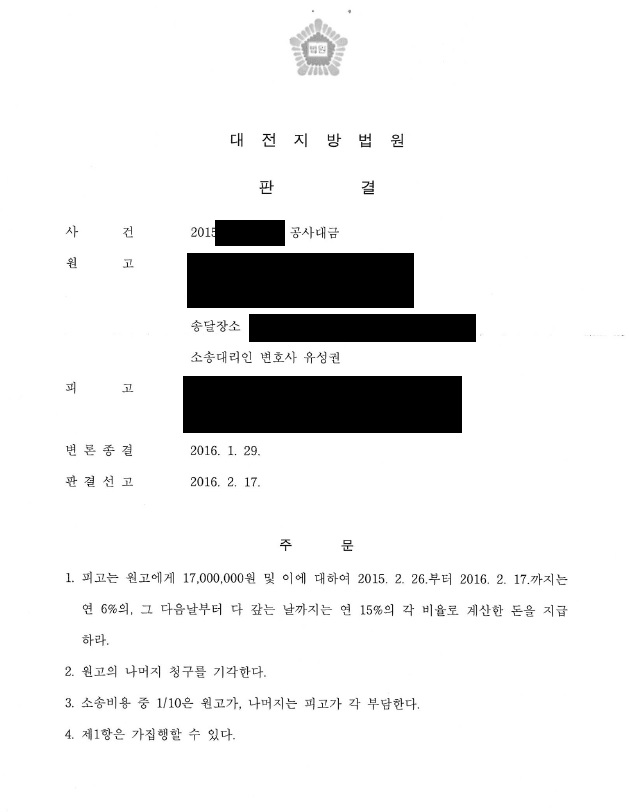 º» »ç°ÇÀº °ø»ç´ë±Ýû±¸ »ç°ÇÀ¸·Î ¿ø°í ÀÎÅ׸®¾î»ç°¡ °ø»ç´ë±ÝÀ» ¹ÞÁö ¸øÇÏ¿© ÇÇ°í¿¡°Ô ¹Î»ç¼Ò¼ÛÀ» û±¸ÇÏ°Ô µÈ »ç¾ÈÀÔ´Ï´Ù. À¯¼º±Ç º¯È£»ç°¡ º» »ç°Ç¿¡ ¼Ò¼Û ´ë¸®ÀÎÀ¸·Î Âü¿©ÇÏ¿© Çǰí´Â ¿ø°í¿¡°Ô 17,000,000¸¸¿øÀ» Áö±ÞÇ϶ó´Â ÆÇ°áÀ» ¹Þ°Ô µÇ¾ú½À´Ï´Ù.