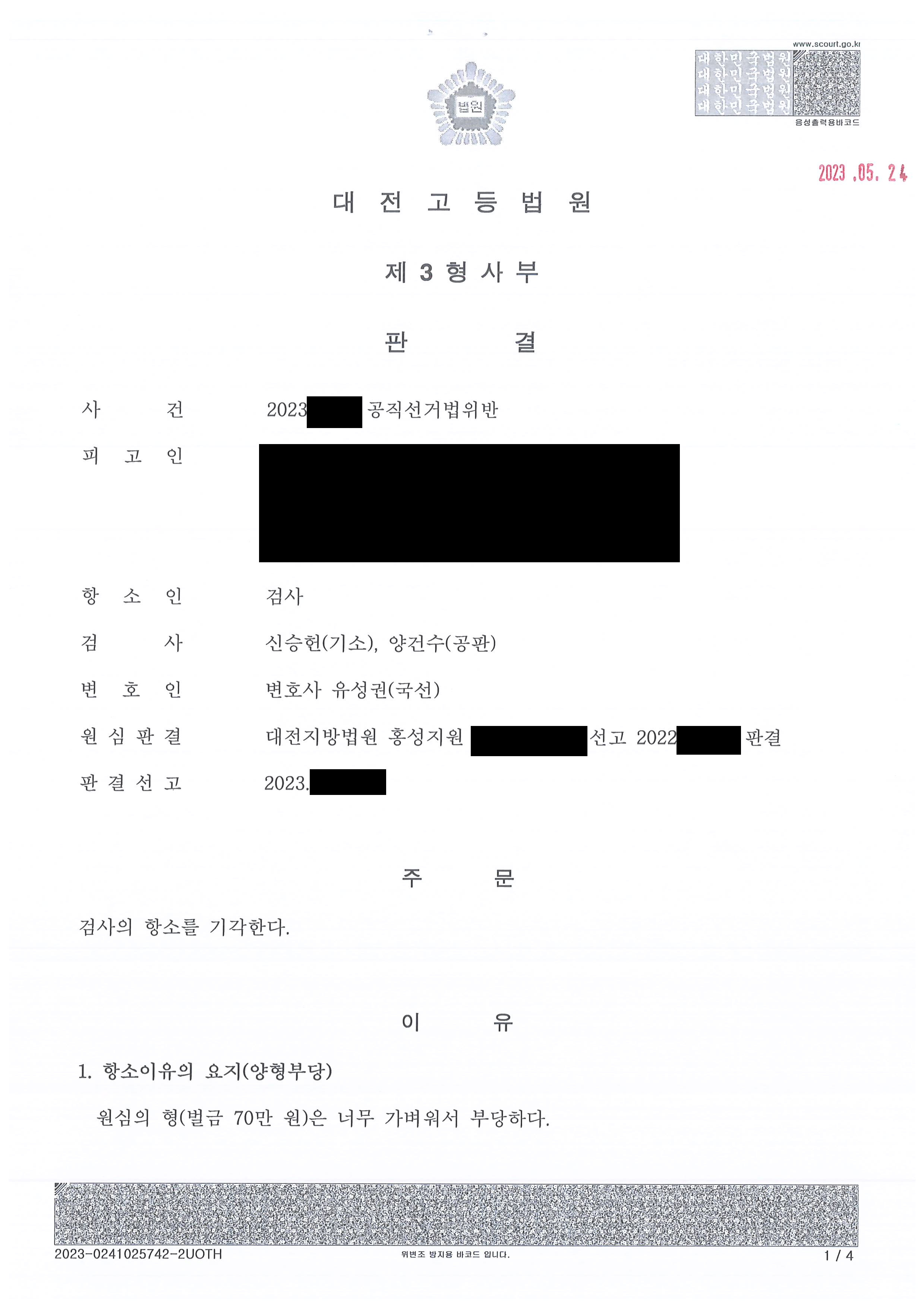 Çü»çÀü¹®º¯È£»ç À¯¼º±Ç º¯È£»çÀÔ´Ï´Ù. ÃÖ±Ù °øÁ÷¼±°Å¹ýÀ§¹ÝÇøÀÇ·Î À԰ǵǾî Çü»ç ÀçÆÇÀ» ¹Þ°í ÀÖ´ø ÇǰíÀÎÀ» ¼±ÀÓÇÏ°Ô µÇ¾ú°í, °Ë»ç°¡ Ç×¼ÒÇÏ¿© 2½É ÀçÆÇ¿¡¼ Áø½ÇÀ» ´ÙÅõ´ø Áß ÀçÆÇºÎÀÇ Çö¸íÇÑ ÆÇ´Ü°ú ÀÇ·ÚÀÎ, º¯È£»ç°£ ±ä¹ÐÇÑ ÇùÁ¶·Î ÁÁÀº °á°ú¸¦ ³»°ÔµÇ¾ú½À´Ï´Ù.