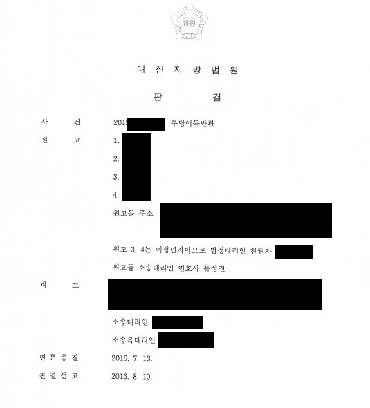 ¿ø°íµéÀÇ ÇҾƹöÁö, ¾Æ¹öÁö°¡ °°Àº ÇØ »ç¸ÁÇÏ°Ô µÇ¸é¼ ¹ß»ýÇÑ »ó¼Ó¿¡ ´ëÇÑ ´ÙÅùÀÔ´Ï´Ù. »ó¼Ó´ë»óÀº ºÎµ¿»êÀÌ¿´À¸¸ç ºÎµ¿»êÀÇ ½Ã°¡´Â 580,000,000ÀÌ¿´½À´Ï´Ù. ±×·±µ¥ ÀÌ ºÎµ¿»ê ÁöºÐÀº ¿ø°í »ó¼ÓÀÎ 4¸íÀº °¢ 1/18, »ó¼ÓÀÎ Çǰí´Â 6/18, ÇǰíÀÇ ¾Æµé »ó¼ÓÀÎ A, B´Â °¢ 4/18¸¦ »ó¼Ó¹Þ°Ô µÇ¾î ÀÖ¾ú½À´Ï´Ù. ±×·±µ¥ 580,000,000 »ó´çÀÇ ºÎµ¿»êÀ» óºÐÇÏ¸é¼ ¸Å¸Å´ë±ÝÁß 47,000,000¿øÀ» ¿ø°íµé¿¡°Ô Áö±ÞÇÏ¿´À¸³ª Ãß°¡ Á¤»ê±ÝÀ¸·Î °¢ 20,472,222¸¦ ¹ÞÁö ¸øÇÏ¿© ¼Ò Á¦±â¸¦ ÇÏ°Ô µÇ¾ú½À´Ï´Ù. ÀÌÈÄ ÇǰíÃøÀº 47,000,000À» Áö±Þ ÇÏ¸é¼ ´ë±Ý Á¤»êÀ» ¿Ï·áÇÏ¿´´Ù°í ÁÖÀåÇÏ¿´À¸³ª ¿ø°íÃø ¼Ò¼Û´ë¸®ÀÎÃøÀº ÁÖÀå¿¡ ÀÌÀ¯°¡ ¾ø´Ù°í ÆÇ´ÜÀÌ µÇ¾î ½É¸®ÇÑ °á°ú Çǰí´Â ¿ø°íµé¿¡°Ô °¢ 7,755,555¸¦ Áö±ÞÇ϶ó´Â ÆÇ°áÀ» ¹Þ°Ô µÇ¾ú½À´Ï´Ù.