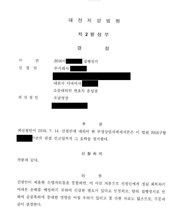 Aȸ»ç´Â ½Å»ý¿¡³ÊÁö °ü·Ã »ç¾÷À» Çϴ ȸ»çÀÔ´Ï´Ù. 2012³â°æ ÁöÀÚü¿¡¼ ¹ßÁÖÇÑ ÅÂ¾ç¿ ±ÞÅÁ½Ã¼³ ¼³Ä¡°ø»ç¿¡ ´ëÇØ °ü·Ã ÀåÄ¡¸¦ ³³Ç° ÇÏ¿´À¸³ª ¾ó¸¶ ÈÄ ÁöÀÚü´Â ³³Ç° ÀåÄ¡¿¡ ÇÏÀÚ°¡ ¹ß»ýÇÏ¿´´Ù¸ç Aȸ»ç¿¡°Ô ÇÏÀÚÁ¶Ä¡ °èȹÀ» ¿ä±¸ÇÏ¿´°í Aȸ»ç´Â ½Ã°øÇöÀåÀ» ¹æ¹®ÇÏ¿© ÇÏÀÚ¿øÀÎÀ» ºÐ¼®ÇÏ¿´Áö¸¸ ³³Ç° ÀåÄ¡¿¡´Â ÇÏÀÚ°¡ ¾ø´Ù°í ´äº¯À» ÇÏ¿´½À´Ï´Ù. ±×·¯³ª ´äº¯¿¡ ´ëÇØ¼ ÁöÀÚü´Â ÇÏÀÚÀÌÇàÀ» ¿ä±¸ÇÏ¿´°í Aȸ»ç´Â ÇÏÀÚ°¡ ¾ø´Ù°í Á¶´Þû¿¡ °ø¹®À» ¹ß¼ÛÇÏ¿´½À´Ï´Ù. ÀÌÈÄ Á¶´ÞûÀº Aȸ»ç°¡ ±¹°¡°è¾à¹ý½ÃÇà·ÉÀ» À§¹ÝÇÏ¿´´Ù°í ÇÏ¿© ºÎÁ¤´ç¾÷ÀÚÁ¦ÀçóºÐÀ» ÇÏ¿´°í Aȸ»ç´Â óºÐ¿¡ ´ëÇÏ¿© »çÀ¯°¡ ¾ø´Ù°í ºÁ¼ ÇöÀç ÇàÁ¤¼Ò¼ÛÁß¿¡ ÀÖ½À´Ï´Ù. ±×·±µ¥ ¼Ò¼Û Áß ÁöÀÚü·ÎºÎÅͺÎÅÍ ¹Þ°Ô µÈ Á¤´ç¾÷ÀÚÁ¦ÀçóºÐÀ¸·Î ÀÎÇÏ¿© óºÐ ÀÌÈÄ ¼öÁÖȰµ¿(ÀÔÂû)À» ÇÏÁö ¸øÇÏ°Ô µÇ¾î ȸ»ç´Â µµ»êÀ§±â¿¡ ºüÁö°Ô µÇ¾ú½À´Ï´Ù. ÀÌ¿¡ À¯¼º±Ç º¯È£»ç´Â ÁýÇàÁ¤Áö°¡ ÇÊ¿äÇÏ´Ù°¡ ÆÇ´ÜµÇ¾î ÁýÇàÁ¤Áö ½ÅûÀ» ÇÏ°Ô µÇ¾ú°í ¹ý¿øÀ¸·ÎºÎÅÍ ¼Ò¼Û ÆÇ°á¼±°í½Ã±îÁö ±× È¿·ÂÀ» Á¤ÁöÇÑ´Ù´Â °áÁ¤À» ¹Þ°Ô µÇ¾ú½À´Ï´Ù.