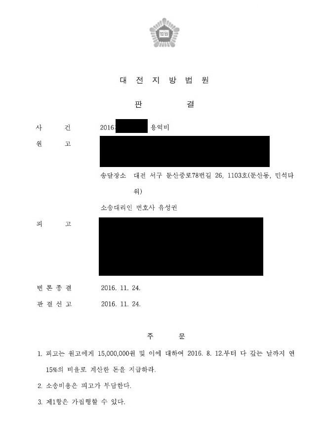 ä±ÇÀÚ´Â 2015³â°æ 乫ÀÚ¿Í ¿ë¿ª °è¾à ü°áÇÏ¿´½À´Ï´Ù. ±×¸®°í ¾àÁ¤¿¡ µû¶ó ÄÁ¼³ÆÃ ºñ¿ë°ú ¿ë¿ª ¼ö¼ö·á¸¦ Áö±ÞÇϱâ·Î ÇÏ°í °è¾à±Ý 15,000,000¿øÀ» Áö±ÞÇÏ¿´À¸³ª °á°úÀûÀ¸·Î °è¾à Á¶°ÇÀÌ ¼ºÃëÇÏÁö ¾Ê°Ô µÇ¾î ä±ÇÀڴ ä¹«ÀÚ¿¡°Ô °è¾à±Ý 15,000,000¿ø°ú Áö±Þ¸í·ÉºÎº» ¼Û´ÞÀÏ ´ÙÀ½³¯ºÎÅÍ ´Ù °±´Â ³¯±îÁö ¿¬ 15%ÀÇ ÀÌÀ²¿¡ ÀÇÇÑ Áö¿¬ ¼ÕÇØ±ÝÀ» Áö±ÞÇ϶ó´Â û±¸¸¦ Á¦±âÇÏ¿´½À´Ï´Ù. ±× °á°ú ¹ý¿øÀ¸·ÎºÎÅÍ Çǰí´Â ¿ø°í¿¡°Ô 15,000,000¿ø ¹× ÀÌ¿¡ ´ëÇÏ¿© ´Ù °±´Â ³¯°¡Áö 15%ÀÇ ºñÀ²·Î °è»êÇÑ µ·À» Áö±ÞÇ϶ó´Â ÆÇ°áÀ» ¹Þ°Ô µÇ¾ú½À´Ï´Ù.