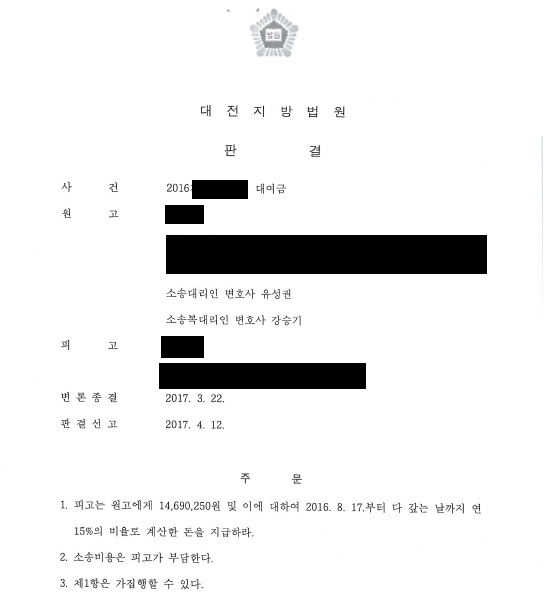 ¿ø°í´Â ÇÇ°í¿¡°Ô µÎ Â÷·Ê¿¡ °ÉÃÄ 14,690,250¿øÀ» ´ë¿©ÇØÁÖ¾úÀ¸³ª ´ë¿©±Ý º¯Á¦¿¡ ÀÀÇÏÁö ¾Ê¾Æ ¼Ò Á¦±â¸¦ ÇÏ°Ô µÇ¾ú½À´Ï´Ù. ÀÌÈÄ ¹ý¿øÀ¸·Î ºÎÅÍ Çǰí´Â ¿ø°í¿¡°Ô 14,690,250¿ø ¹× ÀÌ¿¡ ´ëÇÏ¿© 2016.8. 17ºÎÅÍ ´Ù °±´Â ³¯±îÁö ¿¬ 15%ÀÇ ºñÀ²·Î °è»êÇÑ µ·À» Áö±ÞÇ϶ó´Â ÆÇ°áÀ» ¹Þ°Ô µÇ¾ú½À´Ï´Ù.