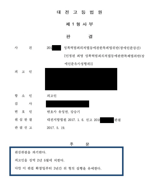 ÇǰíÀÎÀº ÇÇÇØÀÚÀÇ Áý¾ÈÀ¸·Î µé¾î°¡ ÇװźҴÉÀÎ »óŸ¦ ÀÌ¿ë, ÇÇÇØÀÚ¸¦ °£À½ÇÏ¿´´Ù´Â ¹üÁË»ç½Ç·Î ¿ø½É¿¡¼ ¼ºÆø·Â¹üÁËÀÇó¹úµî¿¡°üÇÑÆ¯·Ê¹ýÀ§¹Ý(Àå¾ÖÀÎÁذ°£) ¡¿ª 3³â 6¿ùÀÇ ½ÇÇüÀ» ¼±°í ¹Þ¾Ò½À´Ï´Ù. ÀÌÈÄ Ç׼ҽɿ¡¼´Â ¼ºÆø·Â¹üÁËÀÇó¹úµî¿¡°üÇÑÆ¯·Ê¹ýÀ§¹Ý (Àå¾ÖÀÎÁØÀ¯»ç¼ºÇàÀ§)·Î °ø¼Ò»ç½ÇÀÌ º¯°æµÇ¾î »ç½Ç¿ÀÀÎ, ÇÇÇØÀÚ¿ÍÀÇ ÇÕÀÇ, µ¿Á¾Àü°ú°¡ Á¸ÀçÇÏÁö ¾Ê´Â ´Ù´Â Á¡ µîÀ» ÁÖÀåÇÑ °á°ú, ¡¿ª 2³â 6°³¿ù ÁýÇàÀ¯¿¹ 3³â, º¸È£°üÂû, 40½Ã°£ÀÇ ¼ºÆø·ÂÄ¡·á°ÀÇ ¼ö°ÀÇ ½Â¼Ò ÆÇ°áÀ» ¹Þ°Ô µÇ¾ú½À´Ï´Ù.