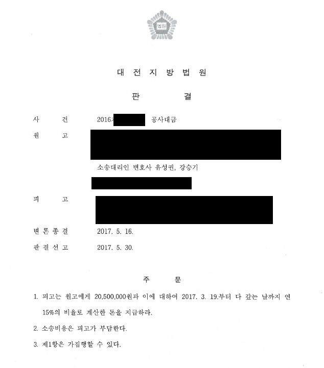 ¿ø°í´Â Çǰí¿Í °ø»ç¾àÁ¤À» ÇÏ°í °ø»ç¸¦ ½ÃÀÛÇÏ¿´À¸³ª Çǰí´Â °ø»ç Á¾·áÈÄ¿¡µµ ¿ø°í¿¡°Ô °ø»ç ´ë±Ý Áö±ÞÀ» ÇÏÁö ¾Ê¾Ò°í °á±¹ ¿ø°í´Â ¼ÒÁ¦±â¸¦ ÇÏ°Ô µÇ¾ú½À´Ï´Ù. ÀÌÈÄ ¹ý¿øÀ¸·ÎºÎÅÍ Çǰí´Â ¿ø°í¿¡°Ô 20,500,000¿ø°ú ÀÌ¿¡ ´ëÇÏ¿© 2017. 3. 19.ºÎÅÍ ´Ù °±´Â ³¯±îÁö ¿¬15% ºñÀ²·Î °è»êÇÑ µ·À» Áö±ÞÇ϶ó´Â ½Â¼Ò ÆÇ°áÀ» ¹Þ°Ô µÇ¾ú½À´Ï´Ù.
