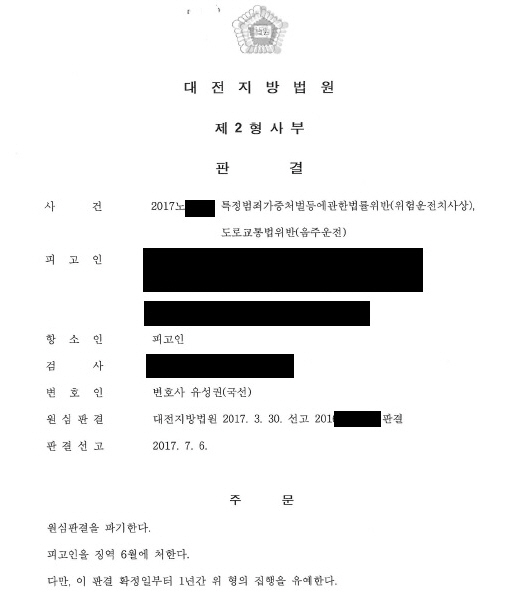 ÇǰíÀÎÀº ¿ø½É¿¡¼ ƯÁ¤¹üÁ˰¡Áßó¹úµî¿¡°üÇѹý·üÀ§¹Ý(À§Çè¿îÀüÄ¡»ó), µµ·Î±³Åë¹ýÀ§¹Ý(À½ÁÖ¿îÀü)À¸·Î ¡¿ª 6¿ùÀ» ¼±°í ¹Þ¾Ò½À´Ï´Ù. ÀÌÈÄ ÇǰíÀÎÀº ¾çÇüºÎ´çÀ» ÀÌÀ¯·Î Ç×¼Ò¸¦ ÇÑ °á°ú Ç׼ҽɿ¡¼´Â ¡¿ª 6¿ù¿¡ ÁýÇàÀ¯¿¹ 1³âÀÇ ½Â¼ÒÆÇ°áÀ» ¹Þ°Ô µÇ¾ú½À´Ï´Ù.